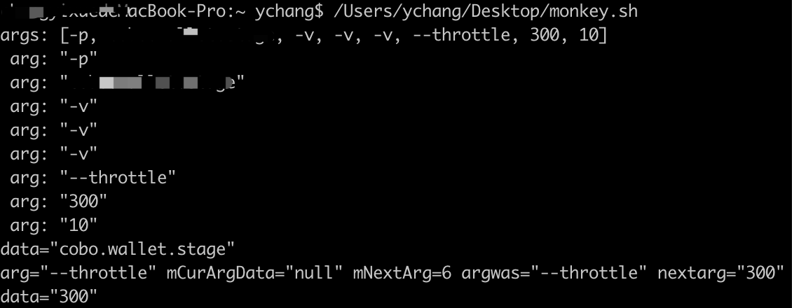 5)把以上命令放在文件monkey.sh中,然后在命令行工具直接输入该文件绝对路径或者拖拽文件到工具中,然后按“Enter”键直接执行文件即可执行命令