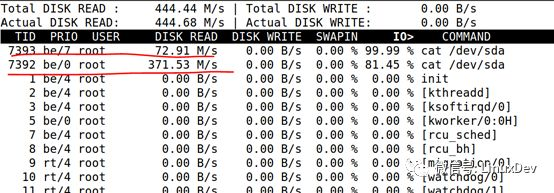 电梯调度里面也执行同样的逻辑,比如CFQ调度算法,可以根据进程的ionice,调整不同进程访问硬盘的时候的优先级。比如,如下2个优先级不同的dd