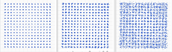 EVM还有一种图形化的表达方式,虽然不如数字表达量化但是可以直观的看到EVM的好坏,就是星座图。星座图上的点越集中表示EVM指标越好,点越发散表示EVM越差,下图是256-QAM信号在不同EVM下的星座图,从左至右表示了EVM从好到坏的变化。