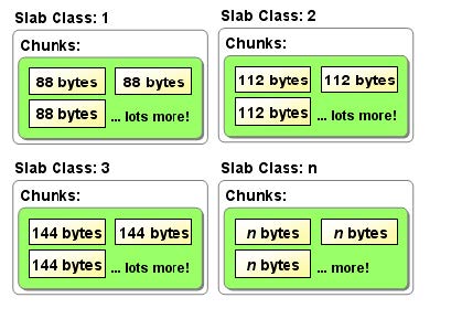 - 将分配的内存分割成各种大小的块(Chunk),并把尺寸相同的块分成组(Slab Class),Memcached根据收到的数据大小,选择最合适的slabClass进行存储