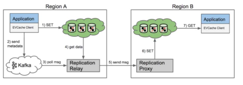 - EVCache客户端库包同时也将写入元数据(包括key,但是不包括要缓存的数据本身)到复制消息队列(Kafka)