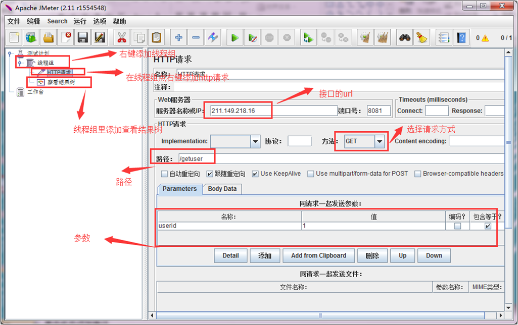 3.在http请求中写入接口的URL,路径,请求方式,参数