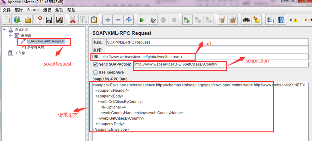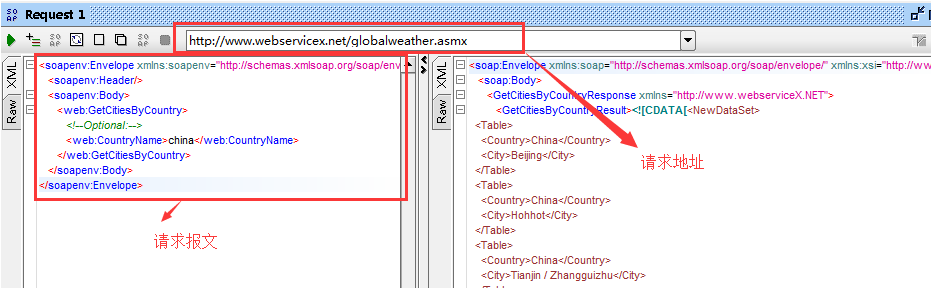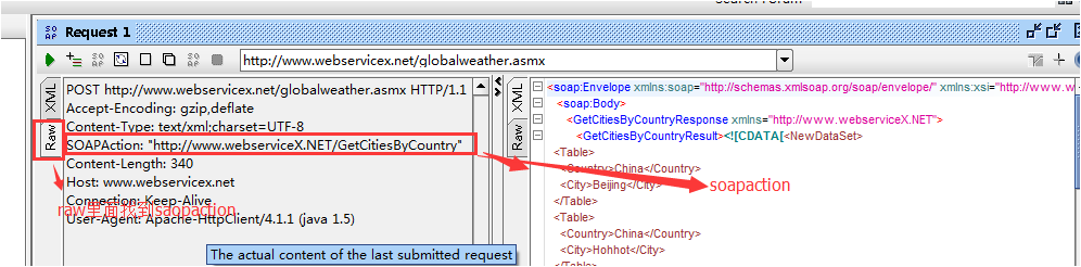 ①在soapui中新建已经soap项目,导入wsdl地址,获取到请求报文、SOAPAction和请求url(在soapui的raw中能找到)