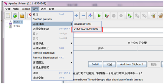 然后在作为控制机的jmeter配置文件里添加压力机ip即可,jmeter的配置文件在bin目录下jmeter.properties,添加压力机的时候,在配置文件里面找到remote_hosts添加ip,然后重启jmeter就可以看到远程压力机了