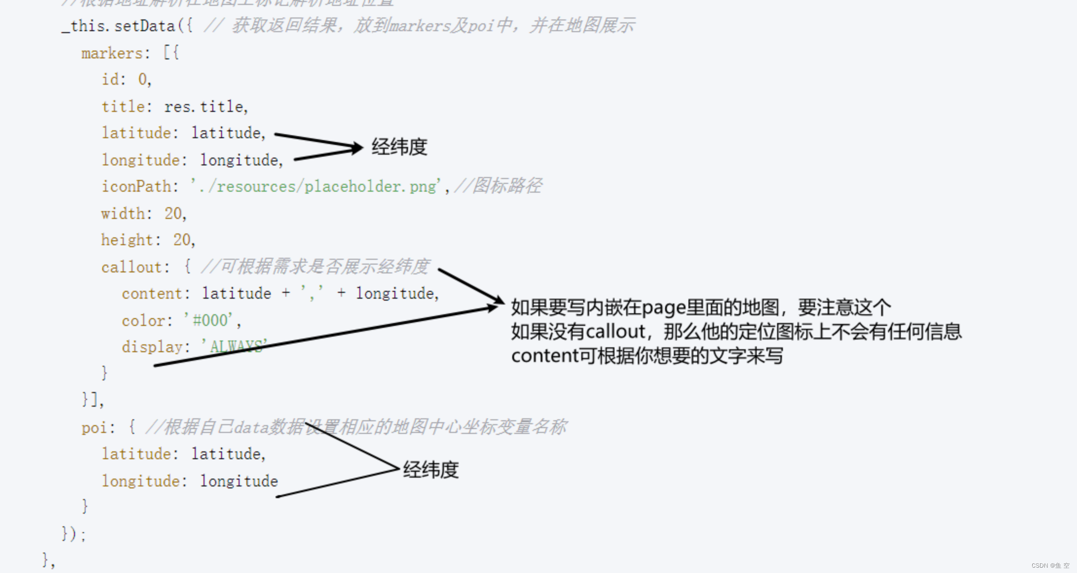 data:{// 经度longitude: '',// 维度latitude: '',markers: [], }
