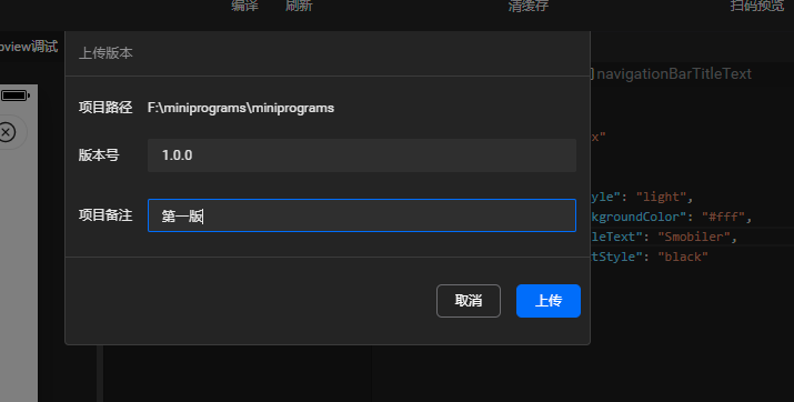 Step.5当页面能正常显示后,点击右上角上传版本按钮,填写项目备注后选择上传