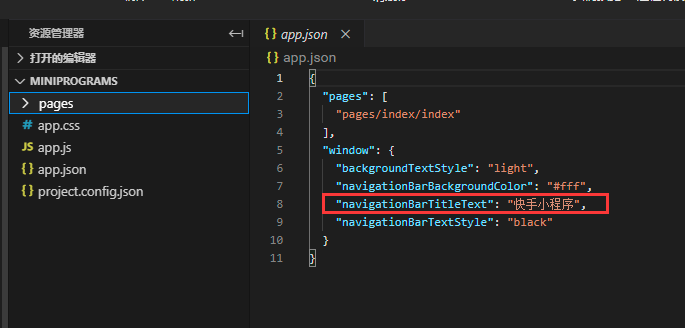 若需要配置默认标题,需要如下图所示,在app.json中修改"navigationBarTitleText": "标题名称"