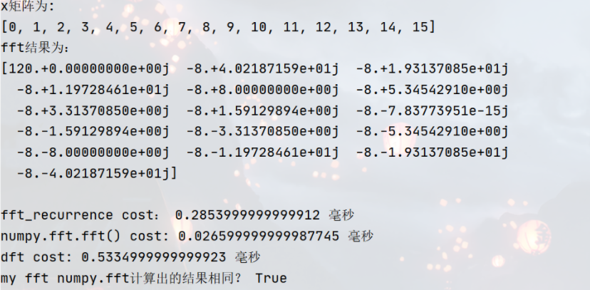 if __name__ == '__main__':#随机生成 维度为1024的列向量x = np.random.random(1024)print('x矩阵为:')print(x)print('fft结果为:')print(fft_recurrence(x))print('')#打印不同方法的fft耗时对比start_1 = time.perf_counter()fft_recurrence(x)end_1 = time.perf_counter()print("fft_recurrence cost:",(end_1-start_1)*1000,'毫秒')start_2 = time.perf_counter()np.fft.fft(x)end_2 = time.perf_counter()print('numpy.fft.fft() cost:', (end_2 - start_2)*1000,'毫秒')start_3 = time.perf_counter()DFT(x)end_3 = time.perf_counter()print('dft cost:', (end_3 - start_3)*1000,'毫秒')# 用numpy.fft的结果和我的fft对比,返回True则两者相同result = np.allclose(fft_recurrence(x),np.fft.fft(x))print('my fft numpy.fft计算出的结果相同?',result)