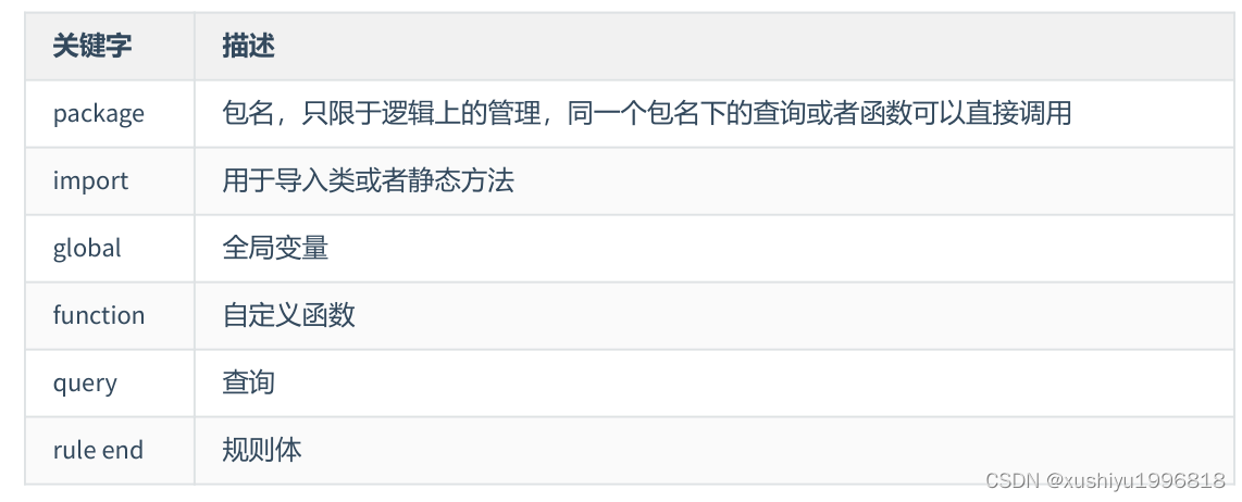 硬关键字是我们在规则文件中定义包名或者规则名时明确不能使用的,否则程序会报错。软关键字虽然可以使用,但是不建议使用。