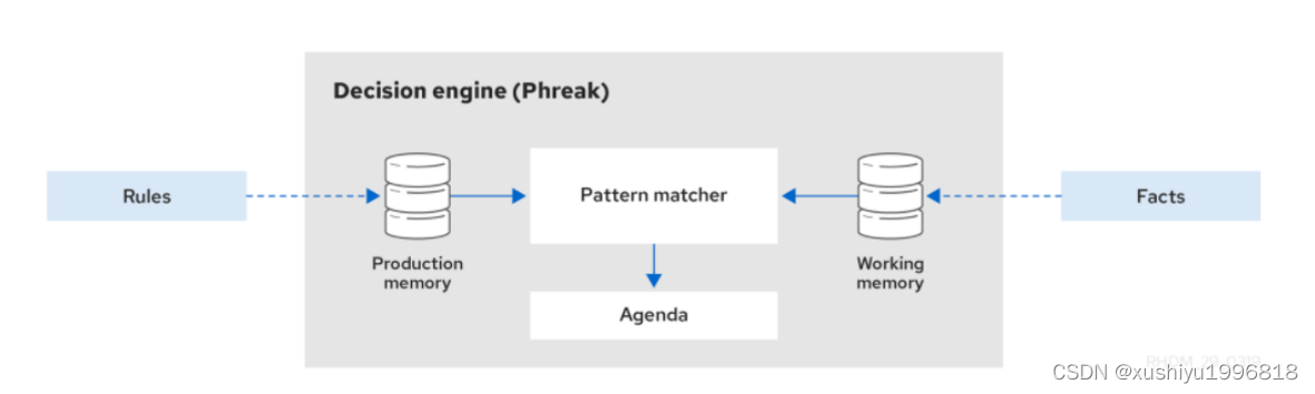 Pattern Matcher:匹配器,将Rule Base中的所有规则与Working Memory中的Fact对象进行模式匹配,匹配成功的规则将被激活并放入Agenda中。