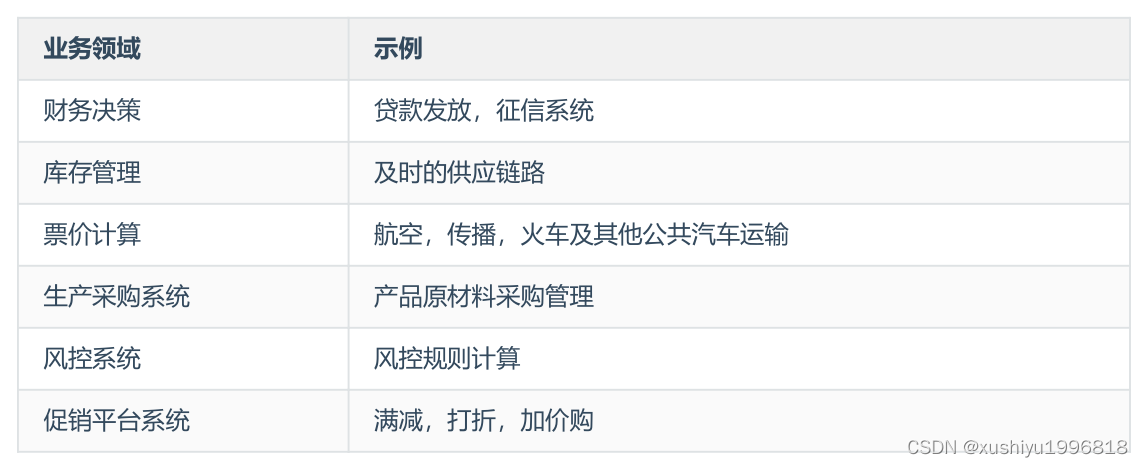 在很多企业的 IT 业务系统中,经常会有大量的业务规则配置,而且随着企业管理者的决策变化,这些业务规则也会随之发生更改。为了适应这样的需求,我们的 IT 业务系统应该能快速且低成本的更新。适应这样的需求,一般的作法是将业务规则的配置单独拿出来,使之与业务系统保持低耦合。目前,实现这样的功能的程序,已经被开发成为规则引擎。