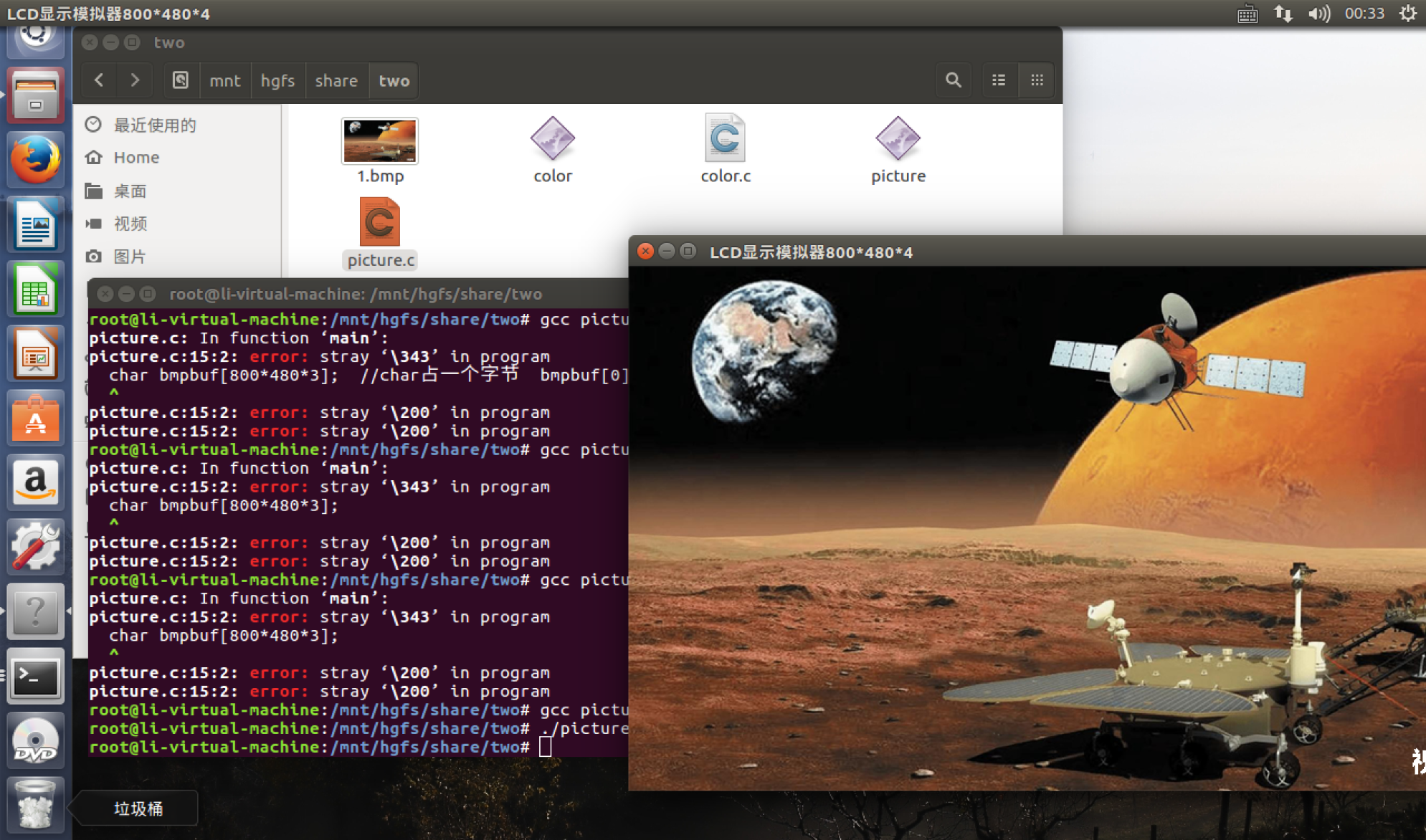 {int fd_lcd;unsigned int *pfb=NULL;unsigned int x,y;unsigned char bmp_buf[480*800*3];//打开虚拟lcd设备fd_lcd = open("/dev/ubuntu_lcd", O_RDWR);if(fd_lcd < 0){perror("open lcd");return -1;}//进行内存映pfb=(unsigned int *)mmap(NULL, //映射区的开始地址,设置为NULL时表示由系统决定映射区的起始地址800*480*4, //映射区的长度PROT_READ|PROT_WRITE, //内容可以被读取和写入MAP_SHARED, //对共享区的写入,相当于输出到文件fd_lcd, //有效的文件描述符0 //被映射对象内容的起点);if(pfb == NULL){perror("mmap");return -1;}//打开资源图片int fd_bmp = open("./1.bmp", O_RDONLY);if(fd_bmp <= 0){perror("open fial");return -1;}lseek(fd_bmp, 54, SEEK_SET);read(fd_bmp, bmp_buf, 480*800*3);close(fd_bmp);int i = 0;for(y=0; y<480; y++){for(x=0; x<800; x++){*(pfb+(479-y)*800+ x) = (bmp_buf[i]<<0) | (bmp_buf[i+1]<<8) | (bmp_buf[i+2]<<16);i += 3;}}/* 取消内存映射 */munmap(pfb, 800*480*4);/* 关闭LCD设备 */close(fd_lcd);/* 没有错误代表正确返回 */return 0;
