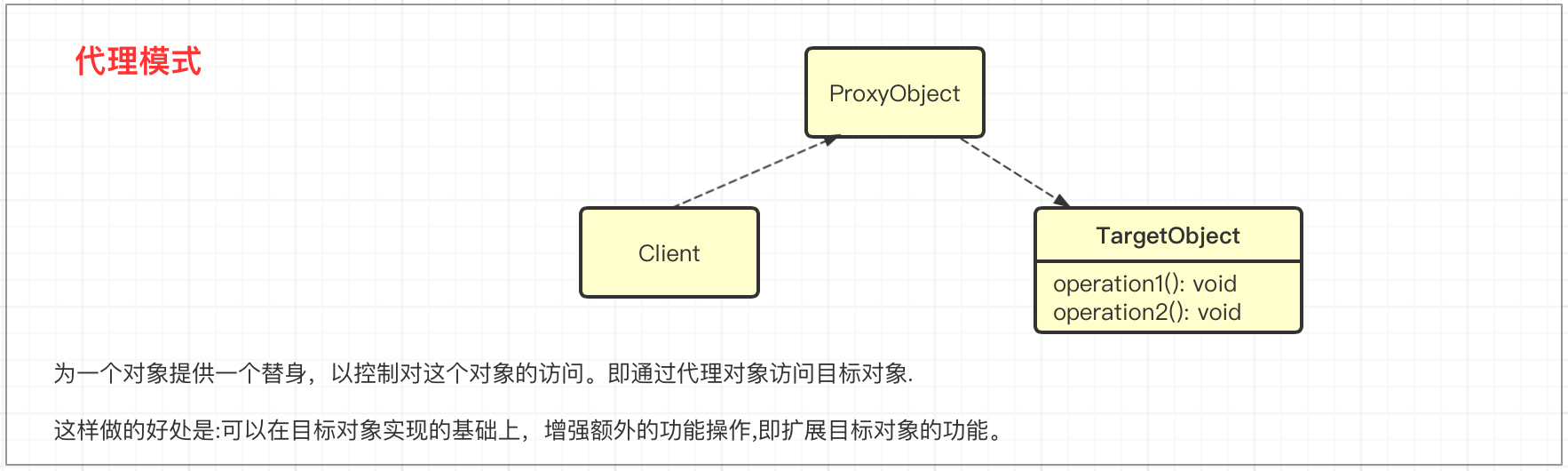 - 代理模式:为一个对象提供一个替身,以控制对这个对象的访问。即通过代理对象访问目标对象.这样做的好处是:可以在目标对象实现的基础上,增强额外的功能操作,即扩展目标对象的功能。