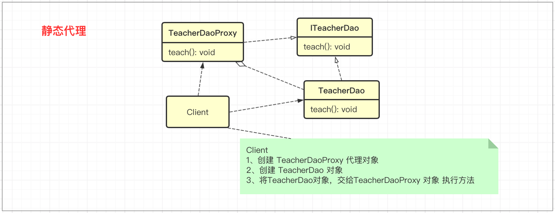 - 使用静态代理方式,就需要在代理对象 TeacherDAOProxy 中也实现 ITeacherDAO