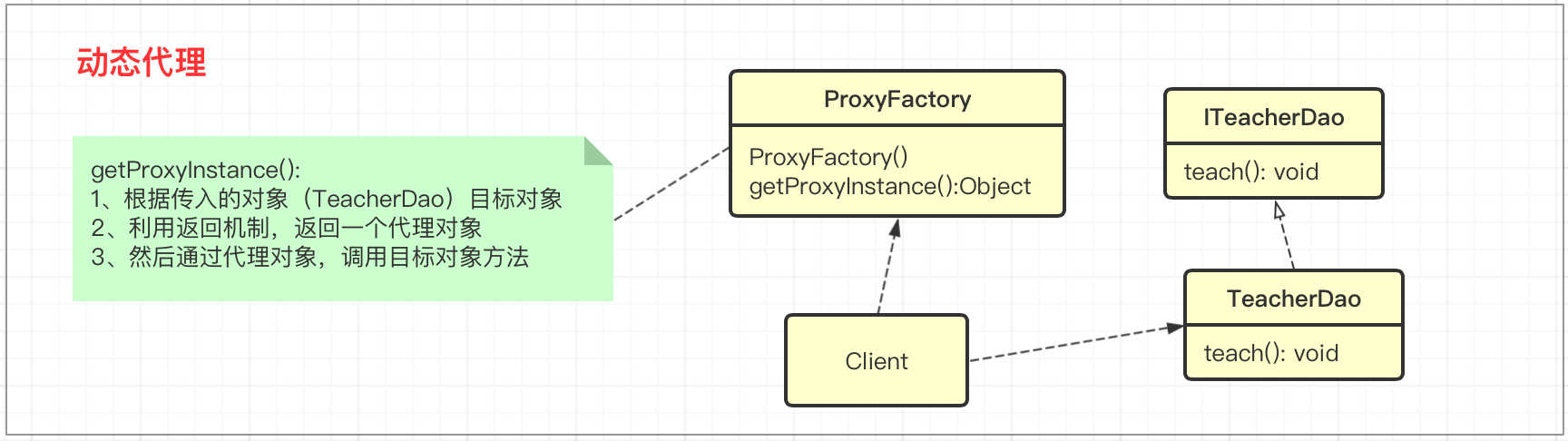 public class Client {public static void main(String[] args) {// 创建目标对象(被代理对象)TeacherDao teacherDao = new TeacherDao();// 创建代理对象,同时将被代理对象传递给代理对象TeacherDaoProxy teacherDaoProxy = new TeacherDaoProxy(teacherDao);// 通过代理对象,调用到被代理对象的方法// 即:执行的是代理对象的方法,代理对象再去调用目标对象的方法teacherDaoProxy.teach();}