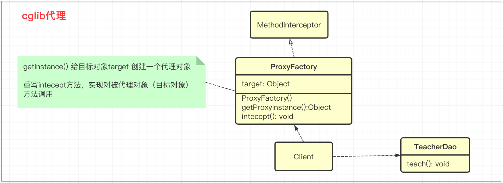 - 静态代理和 JDK 代理模式都要求目标对象是实现一个接口,但是有时候目标对象只是一个单独的对象,并没有实现任何的接口,这个时候可使用目标对象子类来实现代理-这就是 Cglib 代理