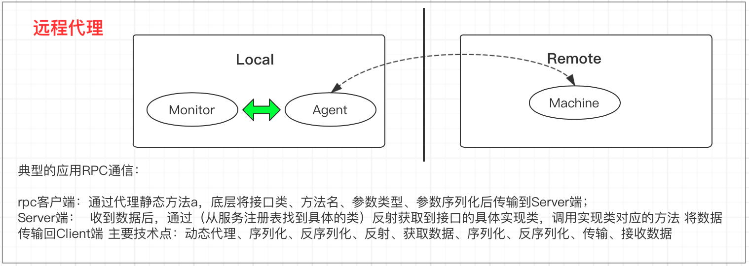 - 远程对象的本地代表,通过它可以把远程对象当本地对象来调用。远程代理通过网络和真正的远程对象沟通信息。