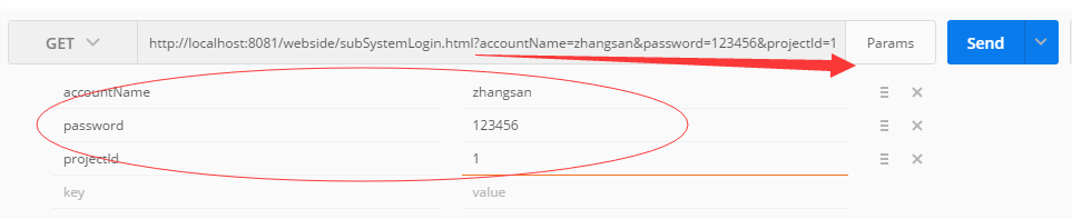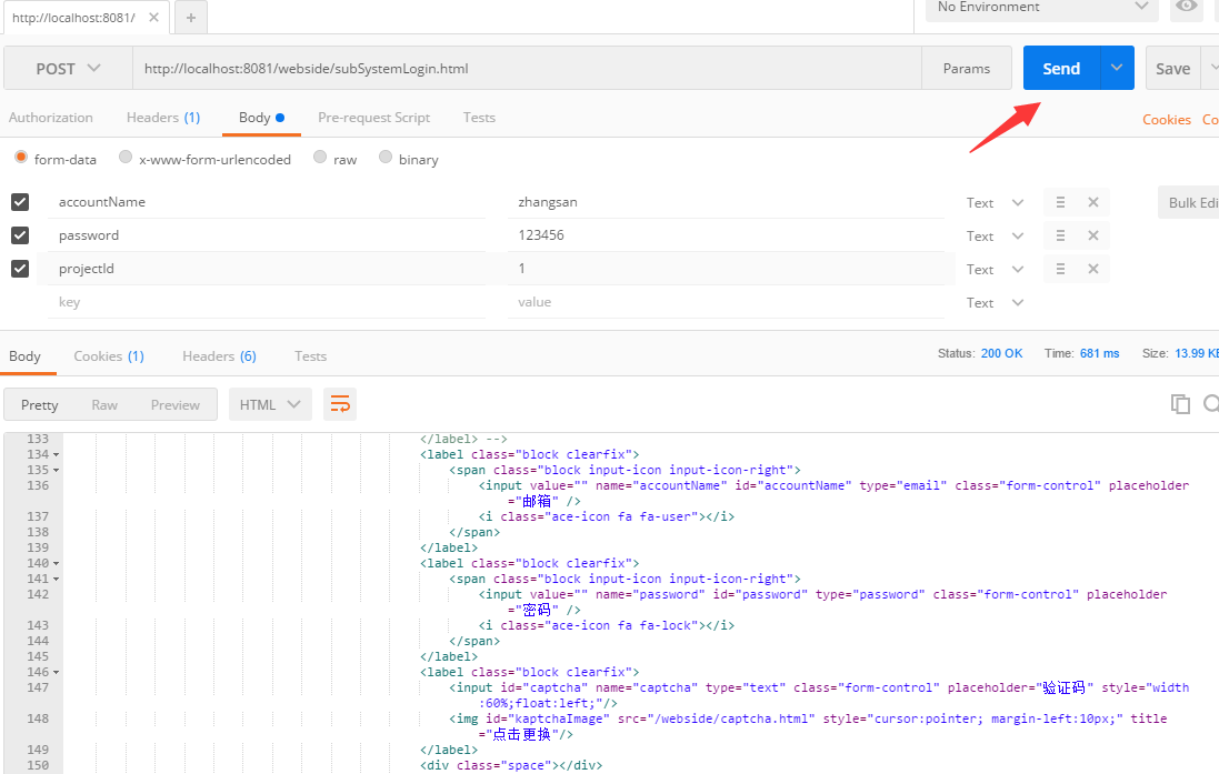 如上图所示,点击send按钮后,调用项目接口,返回的内容是项目登录页面对应的html