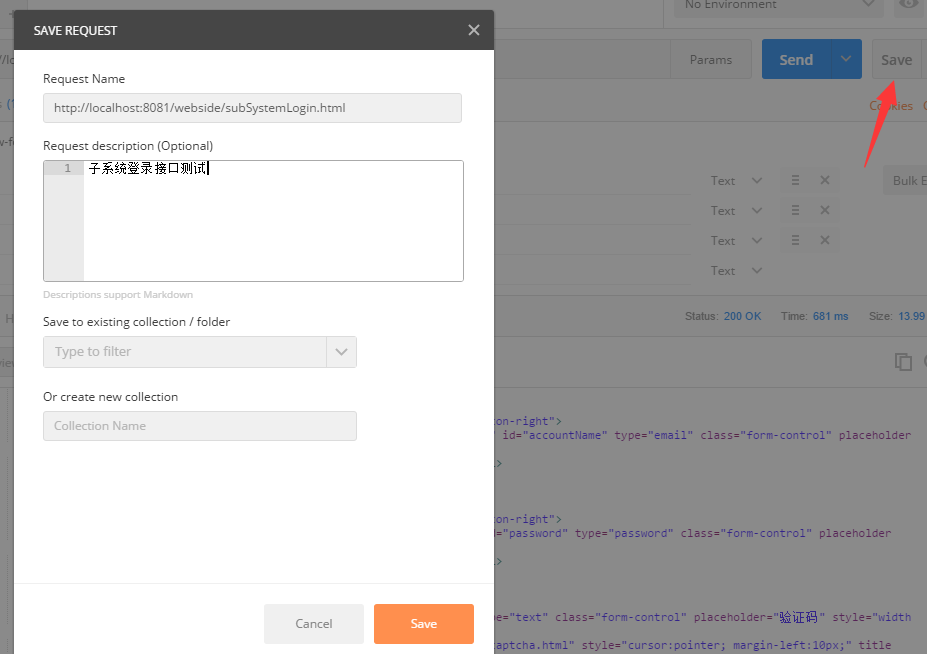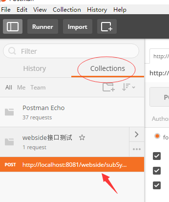 此时,在左侧的Collections中就可以看到我们保存的内容,下次需要测试该接口,直接点击下图中接口对应的箭头指向内容即可。可以给不同的项目创建各自的Collection,将指定的接口测试添加对应的Collection中,这样方便区分。