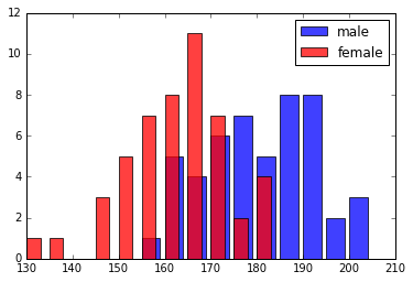 对于 性别 中的 性别:频率 = 列表(fts [性别] . freq_dict . items ())频率。排序(键=拉姆达 X : X [ 1 ])X , ÿ = 拉链(*频率)颜色 = “蓝色” 如果 性别== “男性” 其他 “红色” bar_width = 4 ,如果 性别== “男性” 否则 3 plt 。bar ( X , Y , bar_width , 颜色=颜色, alpha = 0.75 , 标签=性别)PLT 。图例(loc = '右上角' )