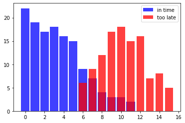 plt . bar ( X2 , Y2 , bar_width , color = "red" , alpha = 0.75 , label = "too late" )