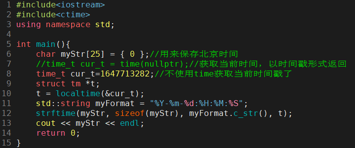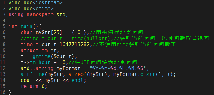 using namespace std;int main(int argc, char **argv){char myStr[25] = { 0 };//用来保存北京时间 //time_t cur_t = time(nullptr);//获取当前时间,以时间戳形式返回 time_t cur_t = 1647713282;//不使用time获取当前时间戳了struct tm *t;t = gmtime(&cur_t);t->tm_hour += 8;//将UTF时间转为北京时间 std::string myFormat = "%Y-%m-%d:%H:%M:%S";strftime(myStr, sizeof(myStr), myFormat.c_str(), t);cout << myStr << endl;return 0;