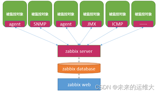 Zabbix通过C/S模式采集数据,通过B/S模式在web端展示和配置,而被监控对象只需要支持SNMP协议或者运行Zabbix agents代理程序即可。服务端监听端口为10051,而被监控端即Zabbix——agents代理程序监控10050端口。