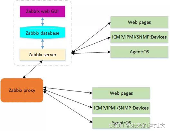 当监控规模变得庞大时,我们可能有成千上万台设备需要监控,那如何分摊巨大的监控压力呢?其实,zabbix天生就有处理这种问题的能力,因为zabbix支持分布式监控,我们可以把成千上万的被监控对象分成不同的区域,每个区域中设置一台代理主机,区域内的每个被监控对象的信息被agent采集,提交给代理主机,我们称这些代理主机为zabbix proxy,zabbix proxy再将收集到的信息统一提交给zabbix server处理。这样,zabbix proxy分摊了zabbix server的压力,同时,我们还能够通过统一的监控入口,监控所有的对象。