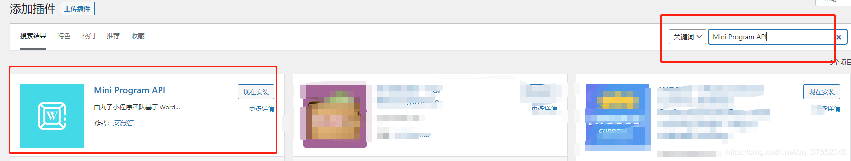 完成了以上的步骤咱们直接进入WordPress后台,输入后台地址:你的域名/wp-admin,登录后台以后我们点击插件,搜索Mini Program API插件安装,就可以连接你的网站数据同步到小程序端