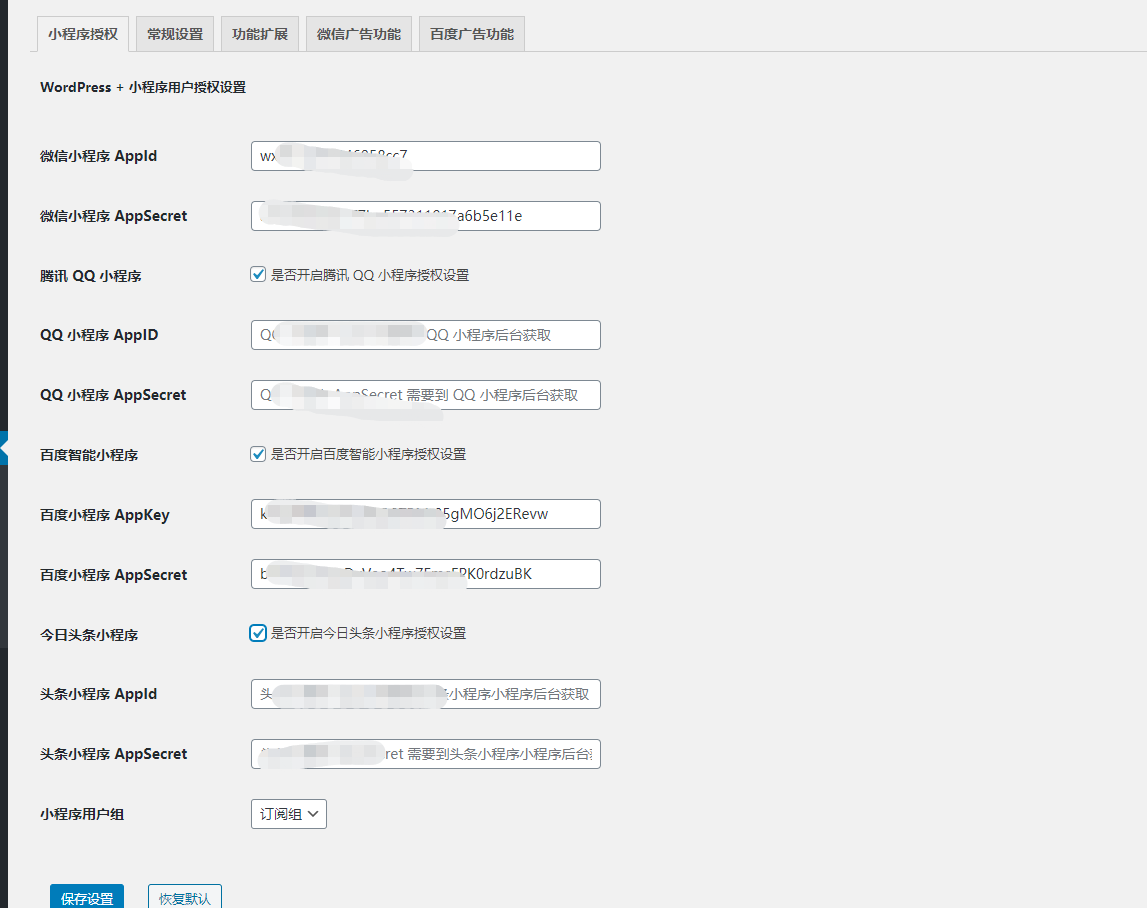安装完成插件我们打开启用插件设置,根据上面安装的Mini Program API插件设置您的微信小程序/QQ小程序/百度小程序信息。以便于同步你的网站信息可以更新到你的小程序。