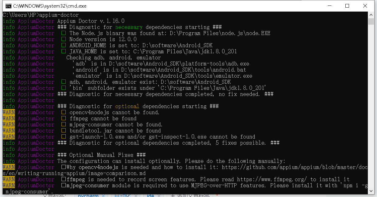 之后输入appium-doctor如果像我这样上面的有几个绿色框框则表示你的appium已经没啥大问题了(本来应该是绿色勾勾的不知道我的为啥是框框,不过没关系。下面那几个报警告的黄色部分是因为我那些插件没有安装,但是我们现在并不需要他们所以不用管他)