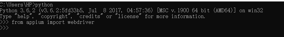 安装完后cmd中输入python进入python命令行,接着输入from appium import webdriver,如果没有报错则表示你已经安装成功(输入后他会自动换行)