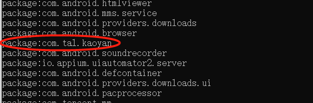 第6行是为了指定包名(这个包名不是安装包的名!)可以先手动将软件安装进手机,然后cmd中输入adb shell pm list package查看已安装软件的包名