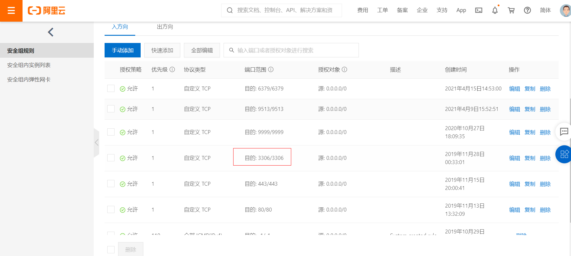 (2)如果是阿里云ECS,记得查看云安全组规则是否开放了3306端口,如果没有,记得加上