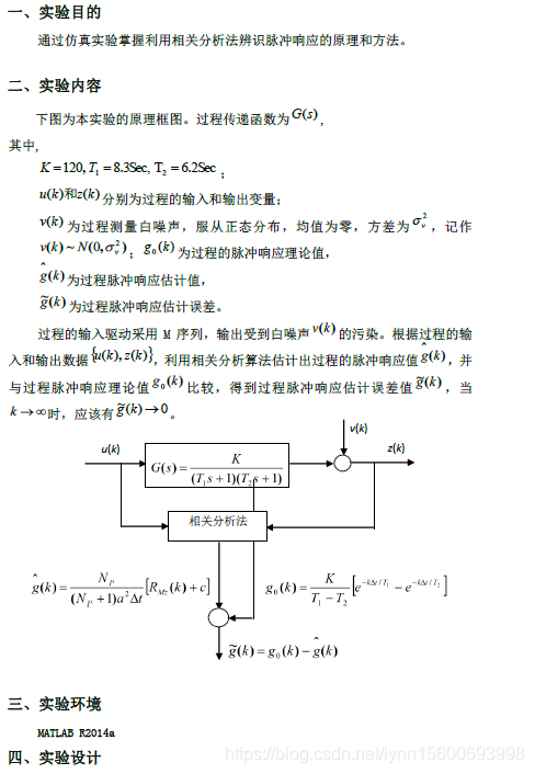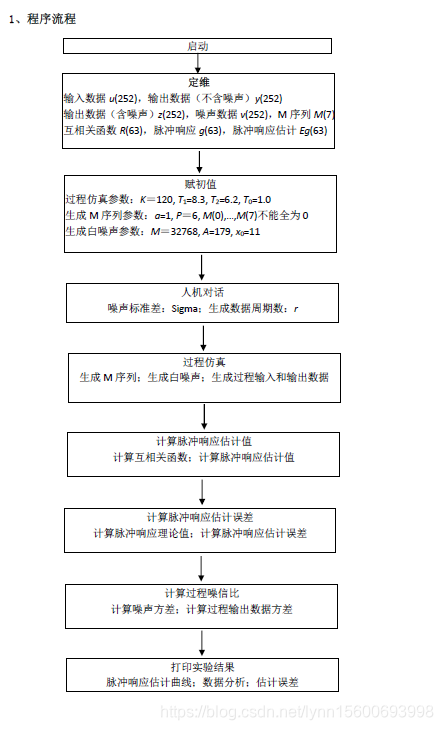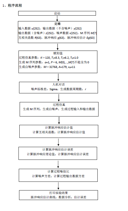 %% 参数初始化 times=1; Np=63;%2^6-1,输入序列循环周期 N=252*times; a=1;%输入序列幅值 T0=1;%采样时间 delta_g=zeros(200,1); ratio_vy=zeros(200,1); %% 人机对话 sigma=input('请输入噪声标准差: '); r=input('请输入循环周期数(本程序中,输入2或3): '); % sigma=0.1; % for r=1:200 %% 生成输入序列 u=createM(Np,a,N); %% 生成噪声序列 v=createV(sigma,N); %% 生成理论值 y=transform(u,T0,N); z=y+v; %% 计算脉冲响应理论值 g0=calculateg0(T0,Np); %% 计算脉冲响应估计值 g1=calculate_z(Np,r,a,u,z,T0); %% 脉冲响应估计误差 g=g0-g1; temp=sqrt(sum(g.^2)/sum(g0.^2)); delta_g(r)=temp; %% 噪信比计算(方差是标准差的平方) d_v=var(v);%噪声方差 d_y=var(y);%过程输出方差 ratio_vy(r)=sqrt(d_v/d_y);%噪信比 % end % 画图 %脉冲响应理论值与估计值的比较 % subplot(1,2,1) figure(1) t=linspace(0,62,63); plot(t,g0,'-b','LineWidth',2); hold on plot(t,g1,'--r','LineWidth',2); title('脉冲响应理论值与估计值') legend('脉冲响应理论值','脉冲响应估计值');%加入噪声前后的输出序列比较 % subplot(1,2,2) figure(2) t=linspace(0,(N-1),N); plot(t,y,'-b','LineWidth',1.5); hold on plot(t,z,'--r','LineWidth',1.5); title('加入噪声前后的输出序列比较') legend('不含噪声的输出序列','含噪声的输出序列'); ylim([-40 40]);