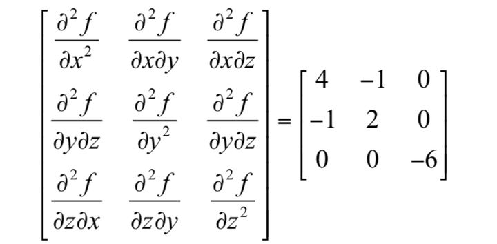 因此Hessian矩阵是一个对称矩阵,它可以看作二阶导数对多元函数的推广。Hessian矩阵简写为 。对于如下多元函数: