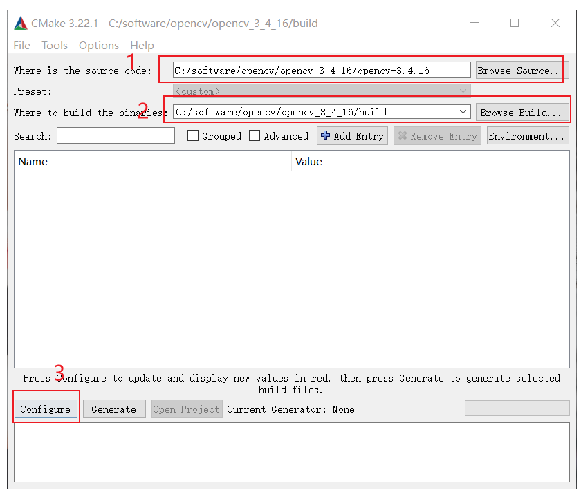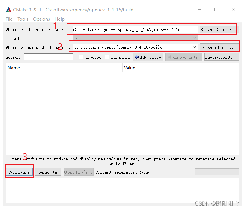 打开Cmake,编译目录选择刚下载的OpenCV源码对应的目录。