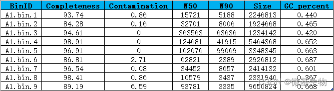 第一列:bin编号;第二列:bin完成度;第三列:bin污染度;第四列:Contig N50;第五列:Contig N90;第六列:一个Bin的所有Contig长度之和,即该基因组草图的总长度;第七列:GC含量是指一个Bin中GC碱基占总碱基的比例。