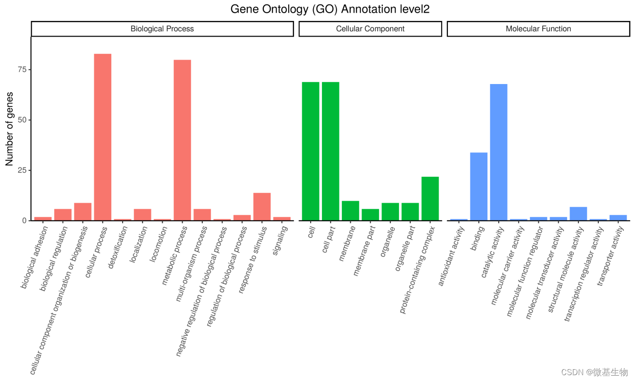 注:该图说明的是其中一个bin预测基因所属GO的情况;纵坐标是数量;横坐标是GO;颜色是GO分类;柱子越高,该GO中包含的预测基因(CDS)越多。