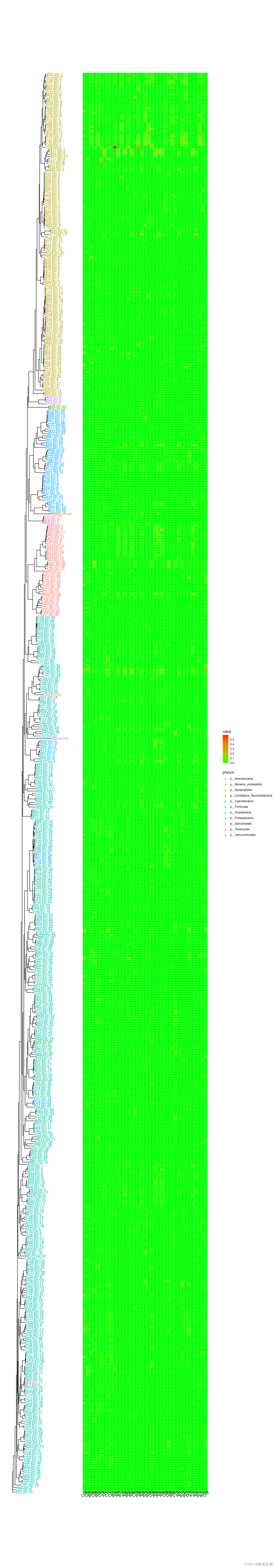 使用 PhyloPhlAn3软件将Bin与SGB.Jul20比对,以获取Bin之间的进化关系树和物种注释。图中的热图展示的是Bin相对丰度信息, 分支不同颜色表示门分类信息。