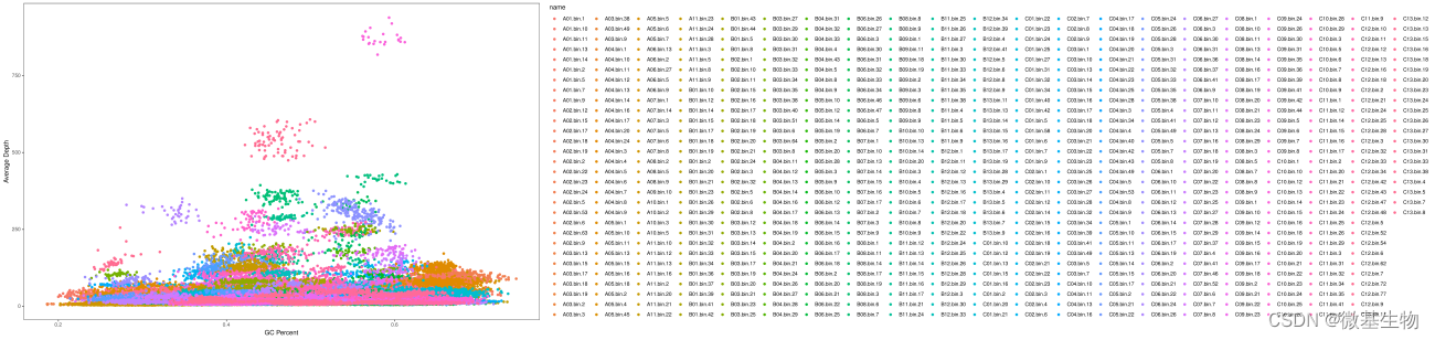 注:横坐标是contig的GC含量;纵坐标是contig depth;一个点代表一个contig,相同颜色的contig来自同一个bin。