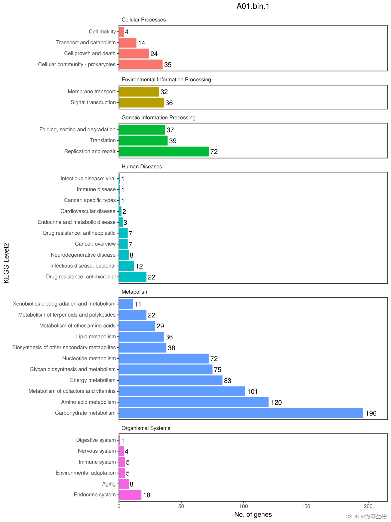 注:横坐标是KEGG level2水平CDS数量;纵坐标是KEGG level 2名称;颜色用于区分KEGG level 1的类型。