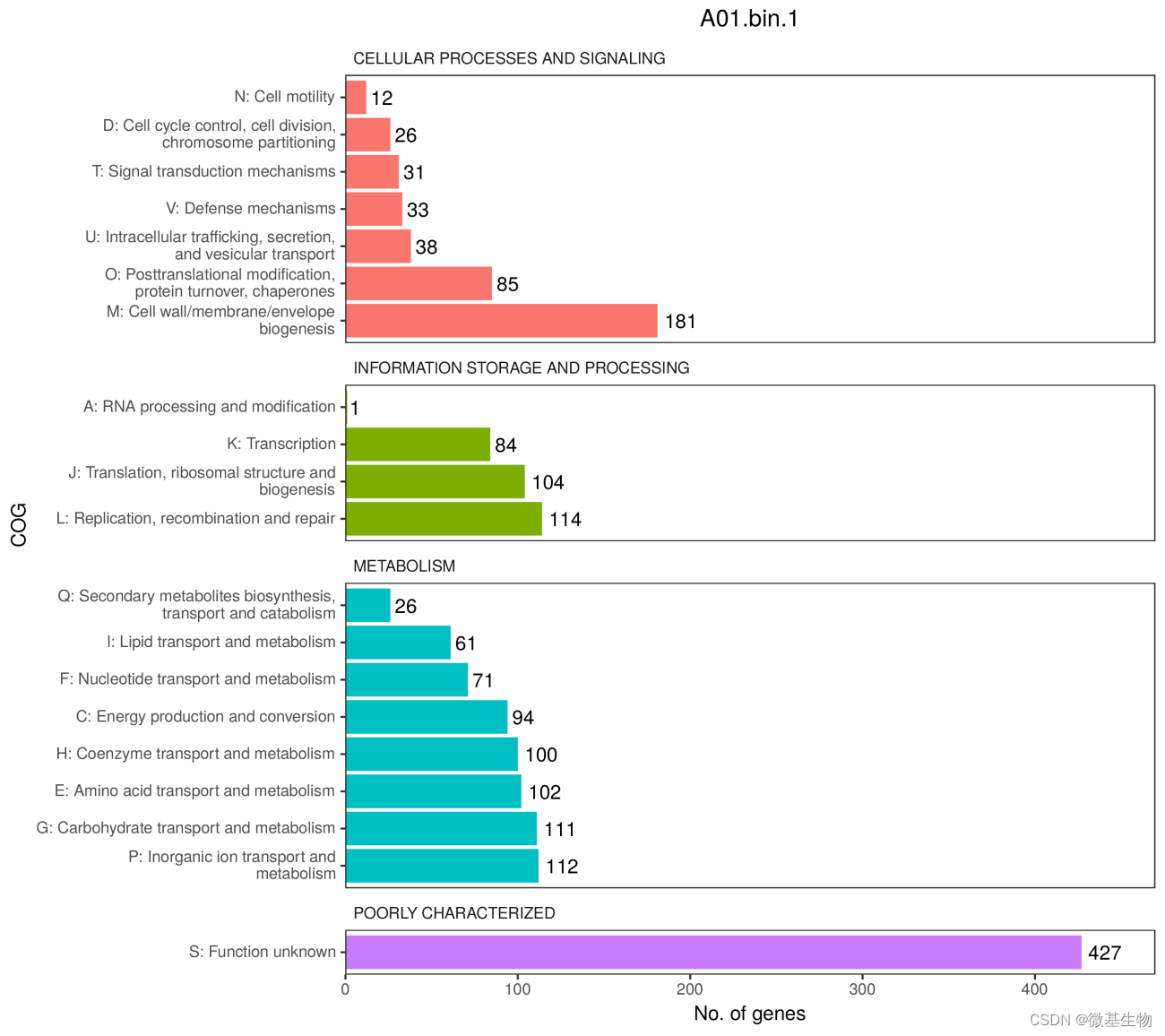 注:纵坐标是COG level 2分类(字母表示,共26种分类);横坐标是注释到的CDS计数;颜色是COG level 1分类(四大类,分别是:细胞过程和信号传递、信息储存和加工、代谢和尚未明确);柱子越长,属于该分类的预测基因越多。