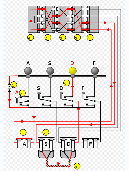 恩尼格玛机的工作原理,在此只显示4个键及灯和其它元件。实际上,恩尼格玛机拥有显示灯,按键,插孔和线路各26个。电流首先从电池①流到双向开关②,再流到接线板③。接线板的作用是将键盘②与固定接口④连接起来。接下来,电流会流到固定接口④,然后流经3个(德国国防军M3)或4个(德国海军M4版和德国阿博维尔情报局版)转子 ⑤,之后进入反射器⑥。反射器将电流从另一条线路向反方向导出,电流会再一次通过转子⑤和固定接口④,之后到达插孔S,又通过一条电线⑧流到插孔D,最后通过另一个双向开关⑨去点亮显示灯。