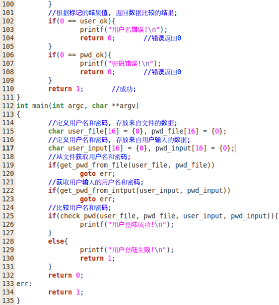在这个程序中,我们实现了一个“用户登陆功能”模块。重点是把用户名和密码保存在文件中,从文件中读取正确的用户名和密码,然后与用户输入的用户名和密码进行比较,判断用户输入的密码是否正确。通过这个项目,我们学习到文件在一般项目中的应用。