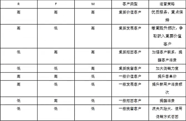 可以先计算出来R、F、M三个值的平均值,然后对客户的每个维度与该维度的平均值进行比较,如果超出平均值就是高,否则就是低。