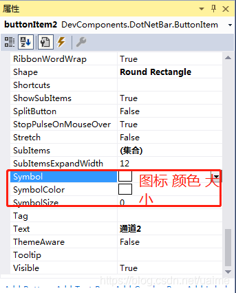 对象buttonItem1的属性(itempanel可以添加的子控件列表对象,根据需要选择,这里用到的Button)