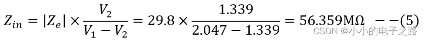 采用上述方法测量某放大电路的输入阻抗,其中信号源输出频率为10Hz,峰峰值为2mV的正弦波信号;电阻Re为30MΩ,电容Ce为100pF,其总阻抗Ze约为29.8MΩ。
