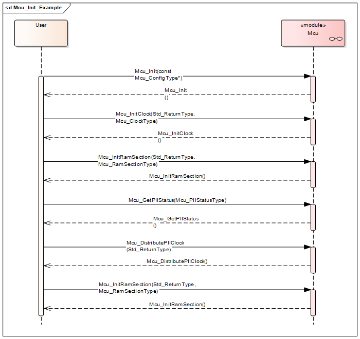 描述了MCU(Microcontroller Unit) 驱动程序的功能和 API。 MCU 驱动程序为其他 MCAL 软件模块所需的基本微控制器初始化、断电功能、复位和微控制器特定功能提供服务。除了启动代码(见下图)之外,初始化服务还允许灵活的和应用程序相关的 MCU 初始化。启动代码非常特定于 MCU。本文档中提供的启动代码描述用于指导在标准化 MCU 初始化能够启动之前必须考虑的功能。