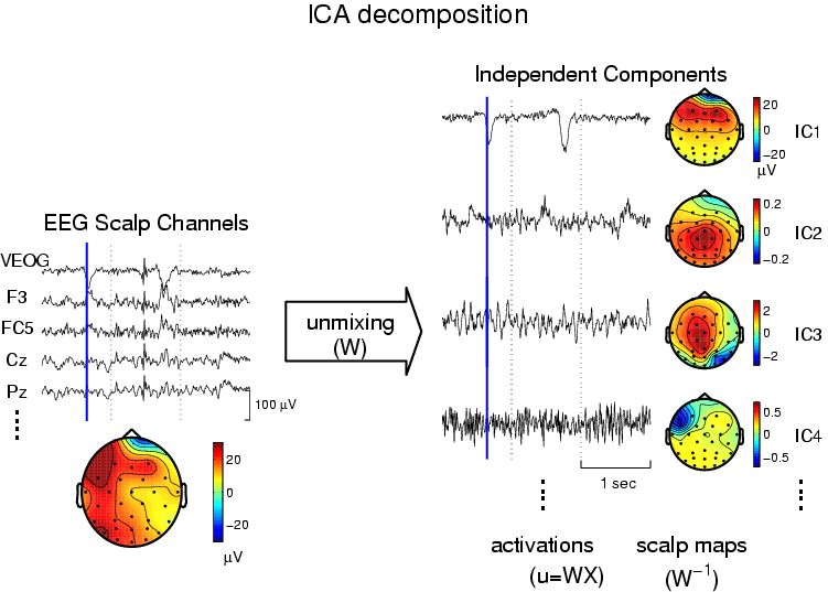 下图显示了该过程的示意图。在EEG分析中,输入矩阵X的行是记录在不同电极上的EEG信号,列是在不同时间点记录的测量值(左)。ICA找到一个“分解”矩阵W,该矩阵将多通道头皮数据分解或线性分解为时间上独立且空间固定的分量之和。输出数据矩阵的行U = WX,是ICA分量激活的时间过程。逆矩阵的列inv(W)给出了每个头皮传感器(右)上各个分量的相对投影强度。这些头皮重量赋予每种成分的头皮形貌,并为这些成分的生理起源提供证据。例如: